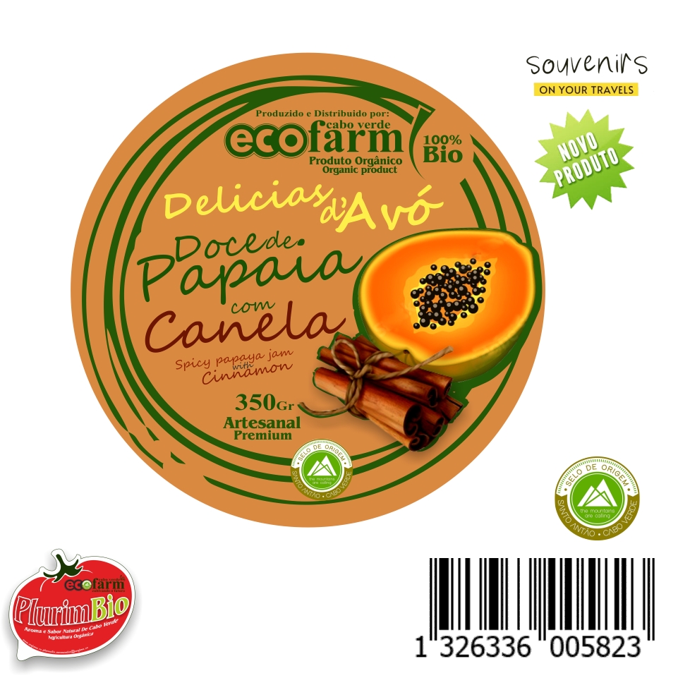 A Ecofarm seleciona papaia da ilha de  Santo Antão, onde o clima quente e o solo vulcânico garantem frutos doces e de textura perfeita. A fruta é cozida lentamente com açúcar de cana e paus de canela, respeitando a tradição das avós cabo-verdianas que faziam doces para guardar em potes de vidro e oferecer nas festas ou a visitas especiais.